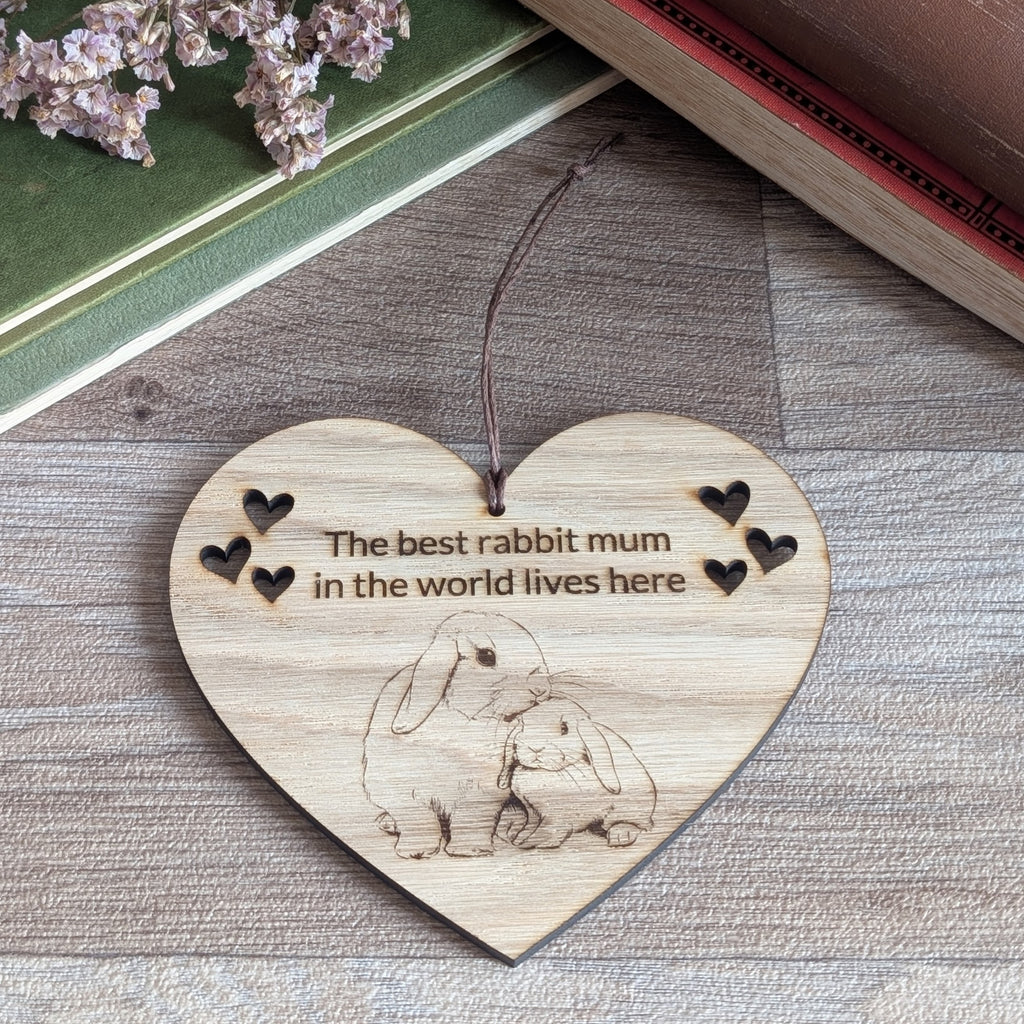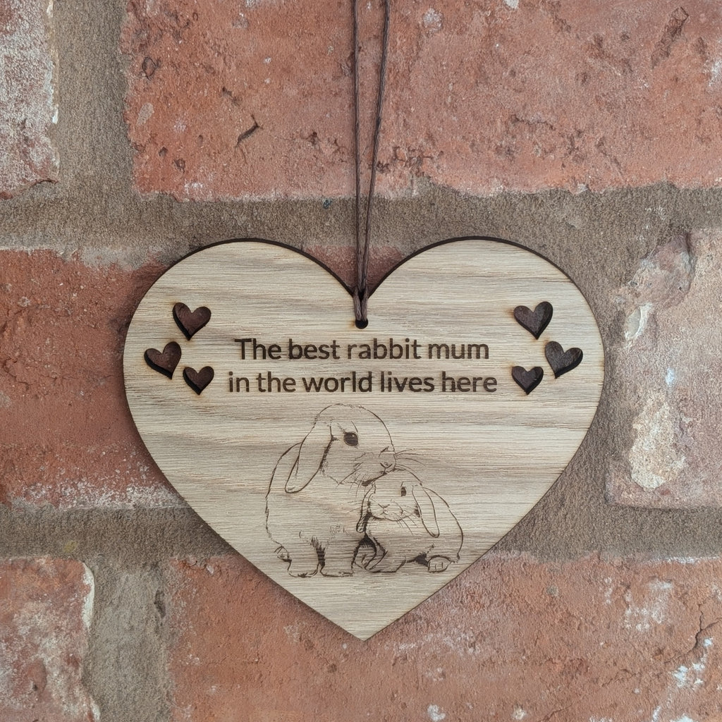 Perfect for adding a little hop of bunny love to your home, our beautiful oak rabbit mum decoration is a must for any bunny lover. Featuring the wording 'the best rabbit mum in the world lives here' our engraved wooden heart would make a wonderful Mother's Day gift.